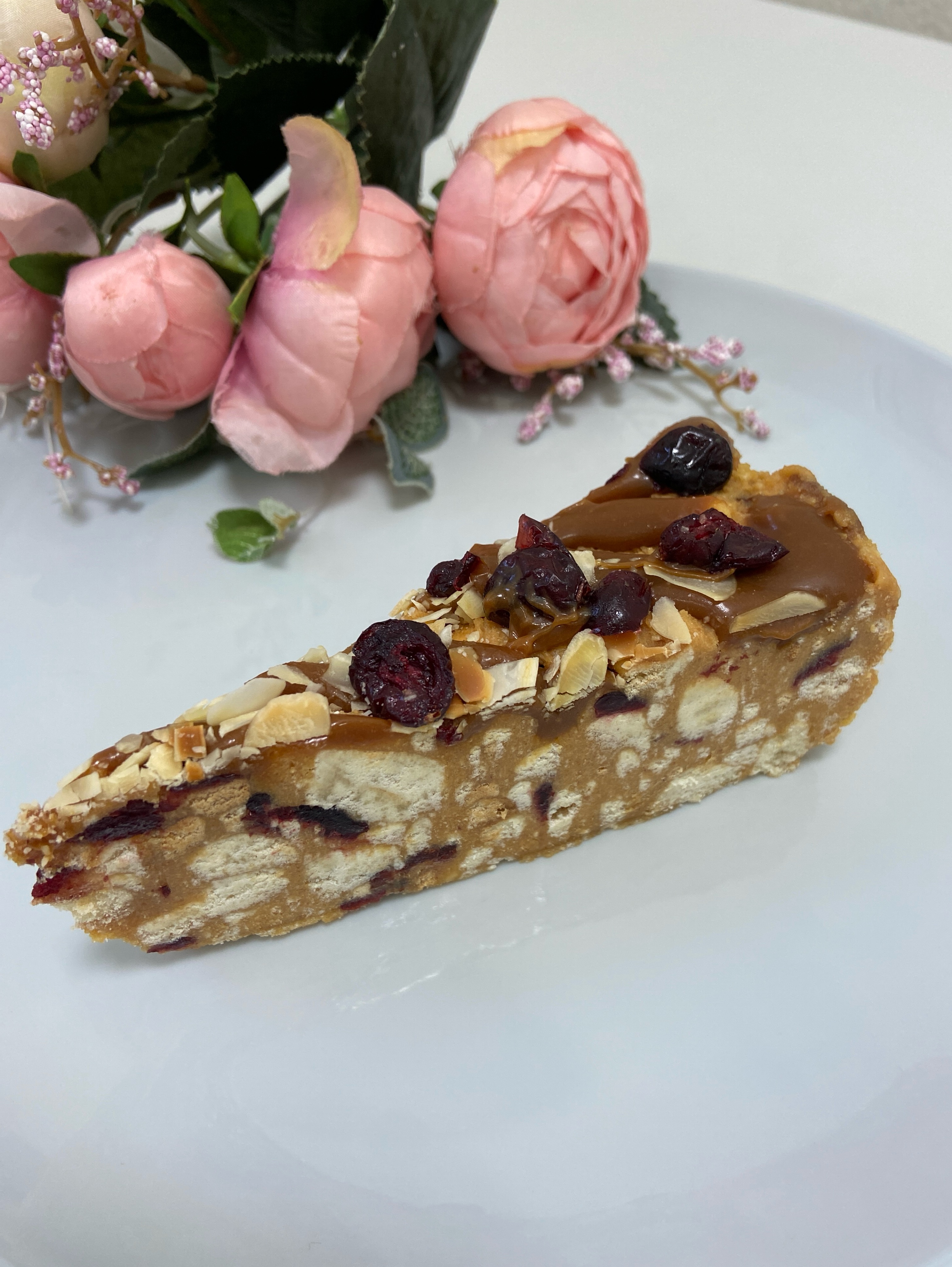 Сочный песочно-карамельный торт с сушеной клюквой и кусочками печенья. Сверху торт украшен волнами мягкой карамели, лепестками миндаля и клюквой