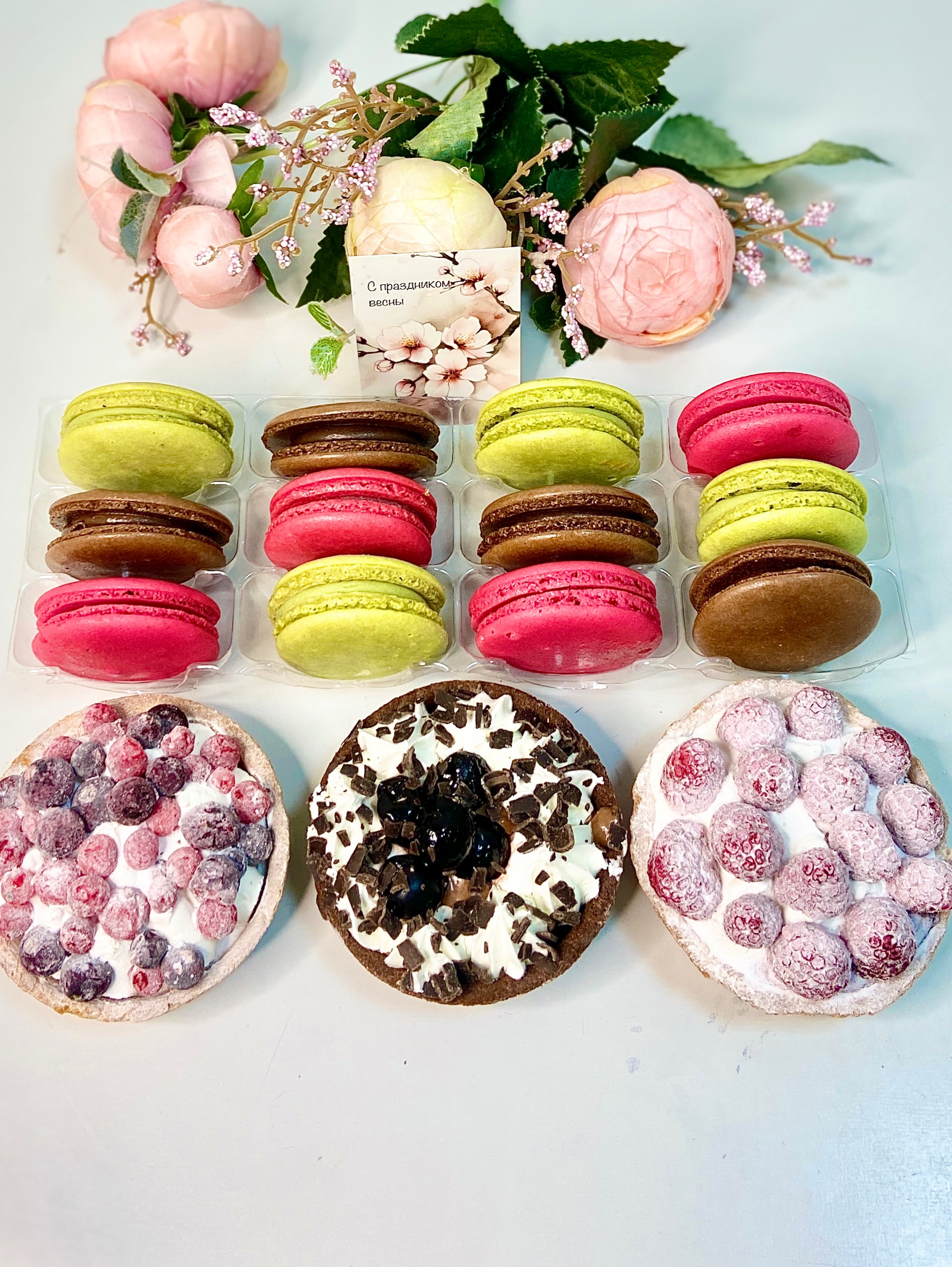 Тарталетка малиновая, Тарталетка вишня в шоколаде, Тарталетка со смородиной, Французские макаронсы (12 шт.). Набор идеально подходит для подарка родственникам, коллегам, друзьям. Открытка с вашими поздравлениями в подарок (текст пишите в комментариях к заказу)