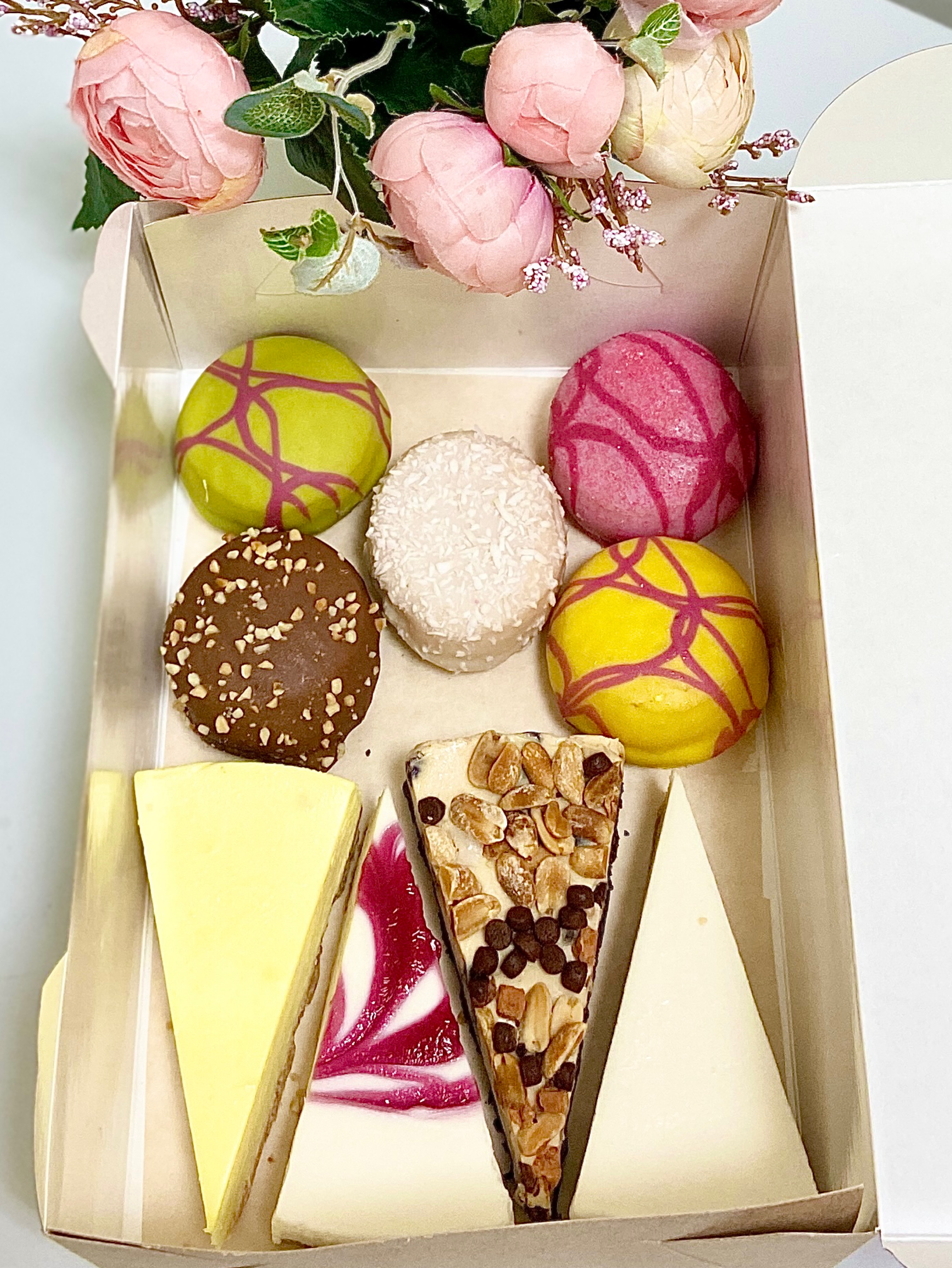 Десертный набор подарит гастрономическое удовольствие. 4 чизкейка ассорти, Берлинер кокос, Берлинер лайм, Берлинер папайя-маракуйя, Берлинер клюква, Берлинер шоколад