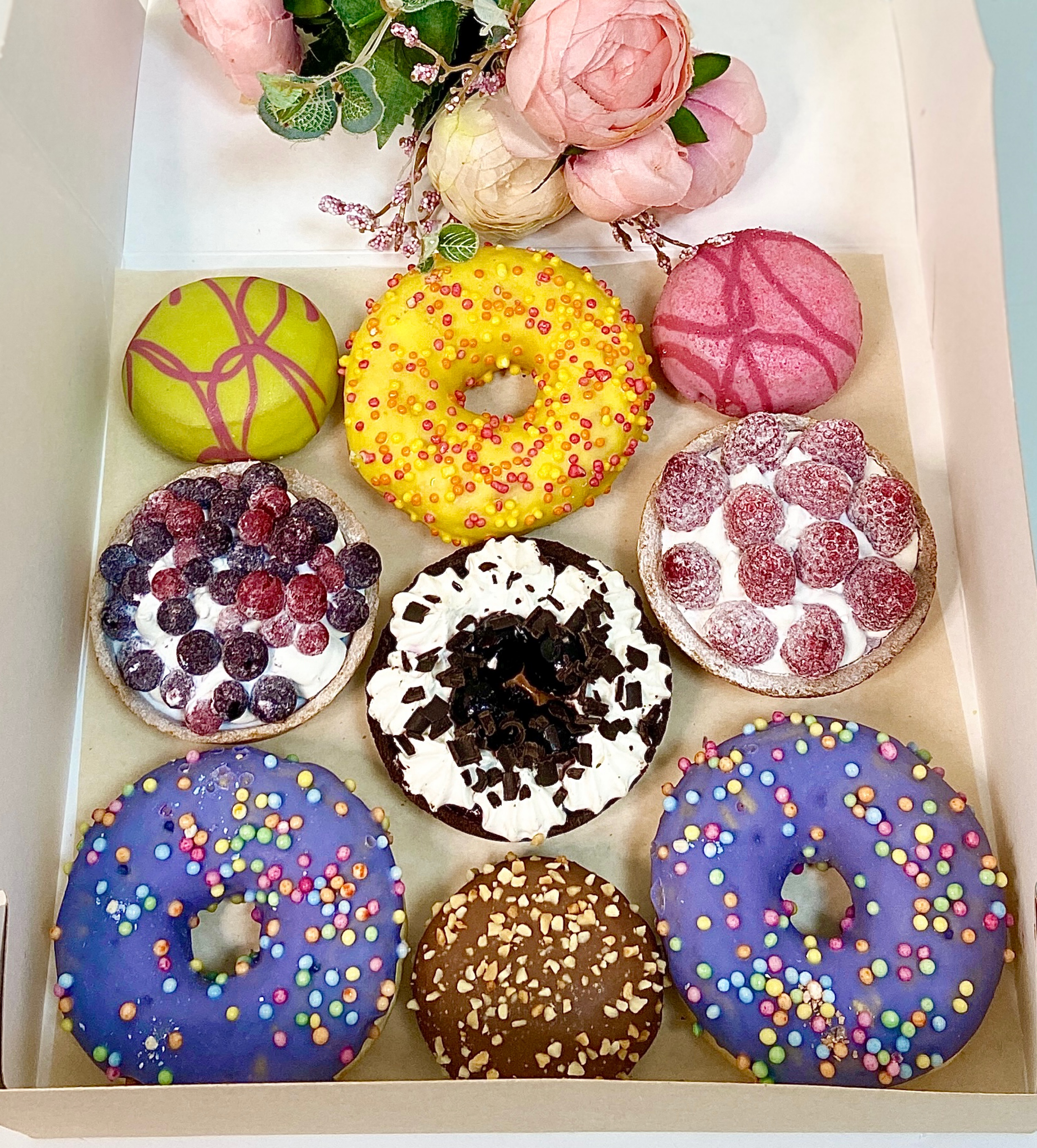 Донат Смородина (2 шт.), донат Манго, тарталетки: Малина, Вишня в шоколаде, Смородина, берлинеры; Клюква, Папайя, Лесной орех. Приложим и подпишем открытку с вашими пожеланиями при необходимости