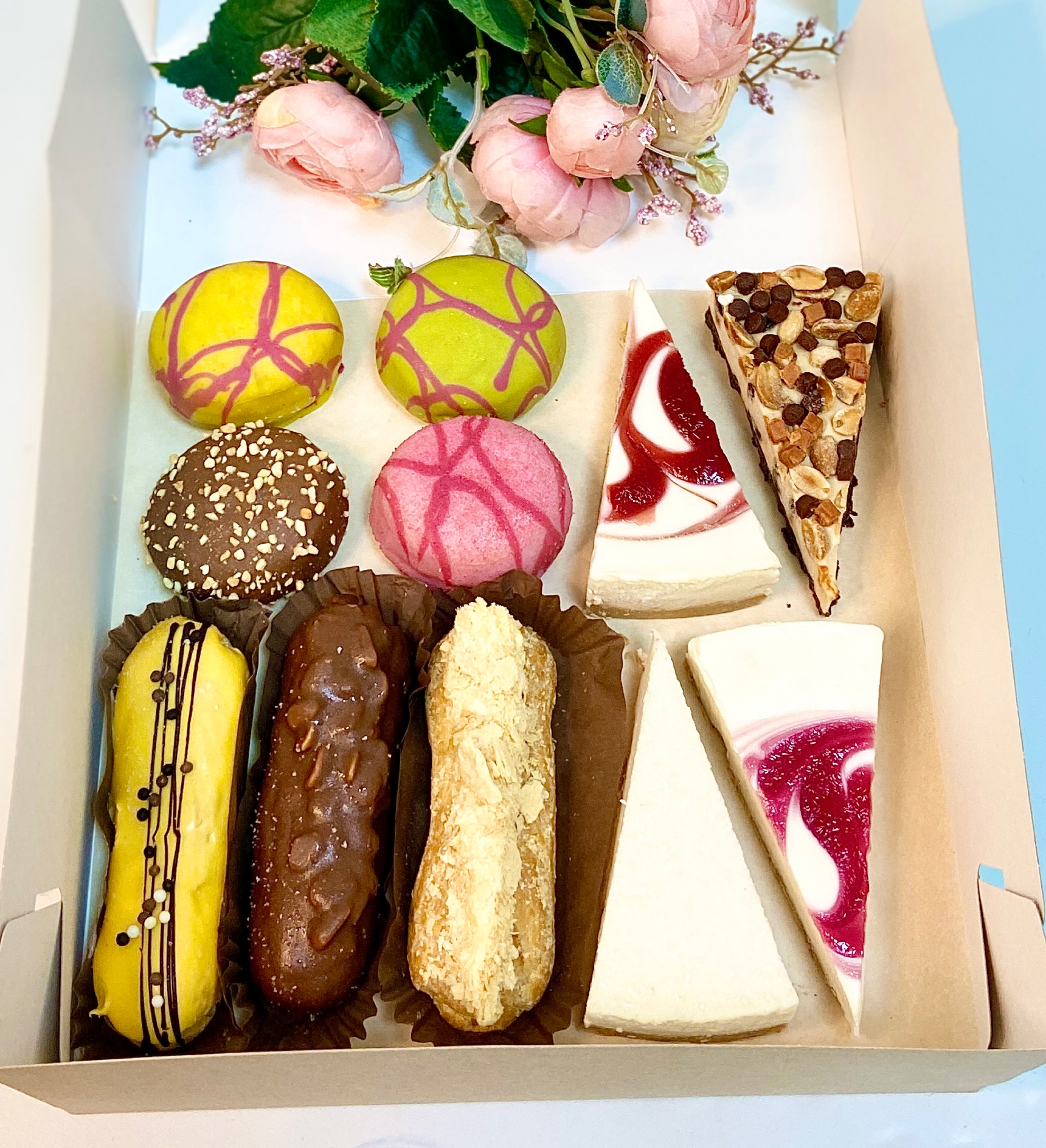 Эклер Манго, Эклер Сникерс, Эклер Наполеон, 4 чизкейка ассорти, Берлинер с начинкой Лайм, Берлинер с начинкой Папайя-маракуйя, Берлинер с начинкой Шоколад, Берлинер с начинкой Клюква. Текст для открытки пишите в комментариях