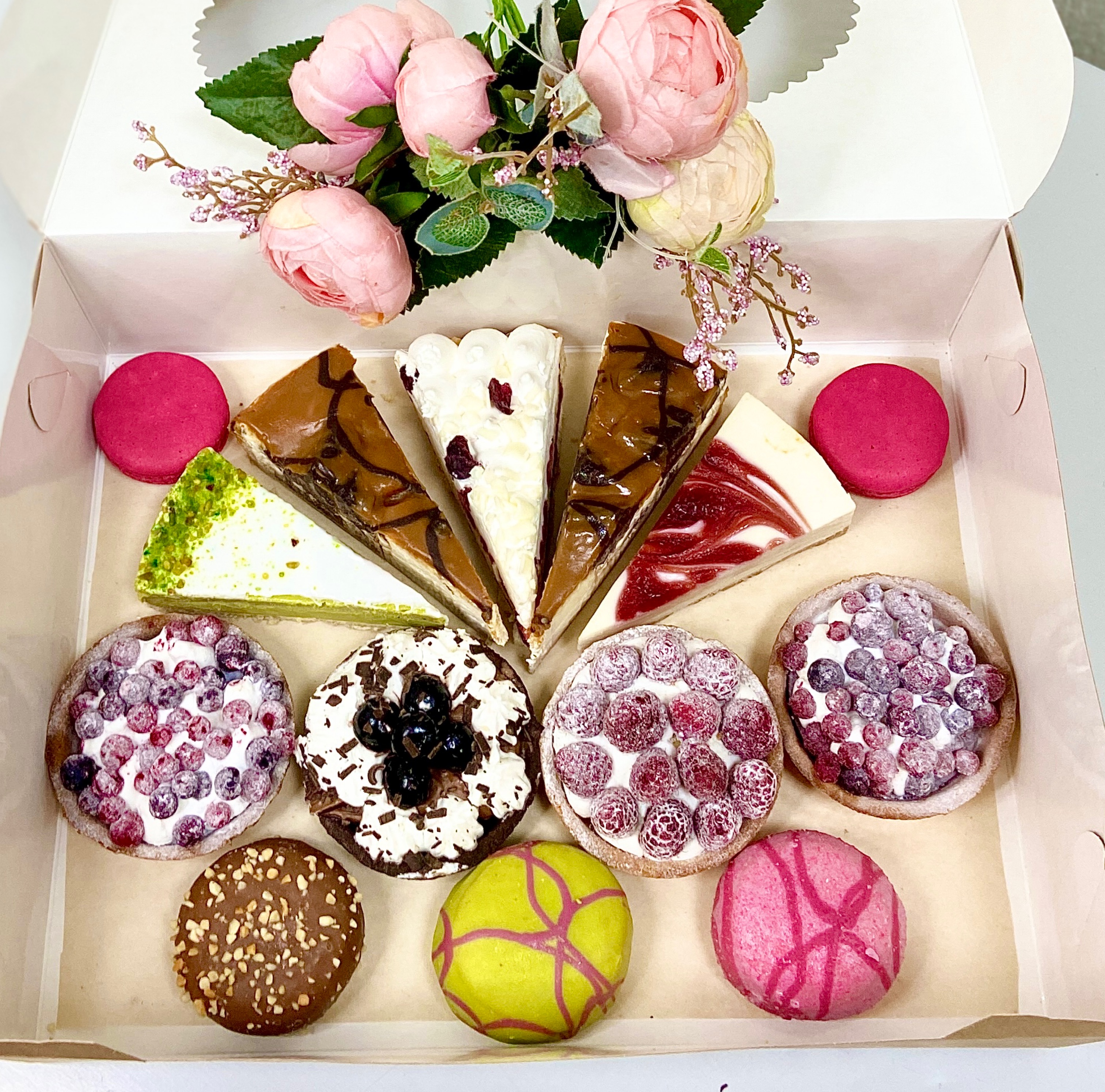 Тарталетки (Вишня в шоколаде, Смородина 2 шт., Малина), Премиальный Чизкейк  с брауни и карамелью 2 шт., Торт Бруснично-кремовый, Премиальный чизкейк фисташковый, Чизкейк Клубника, Французский макаронс 2 шт., Берлинер с начинкой Нутелла, Берлинер с начинкой клюква, Берлинер с начинкой папайя